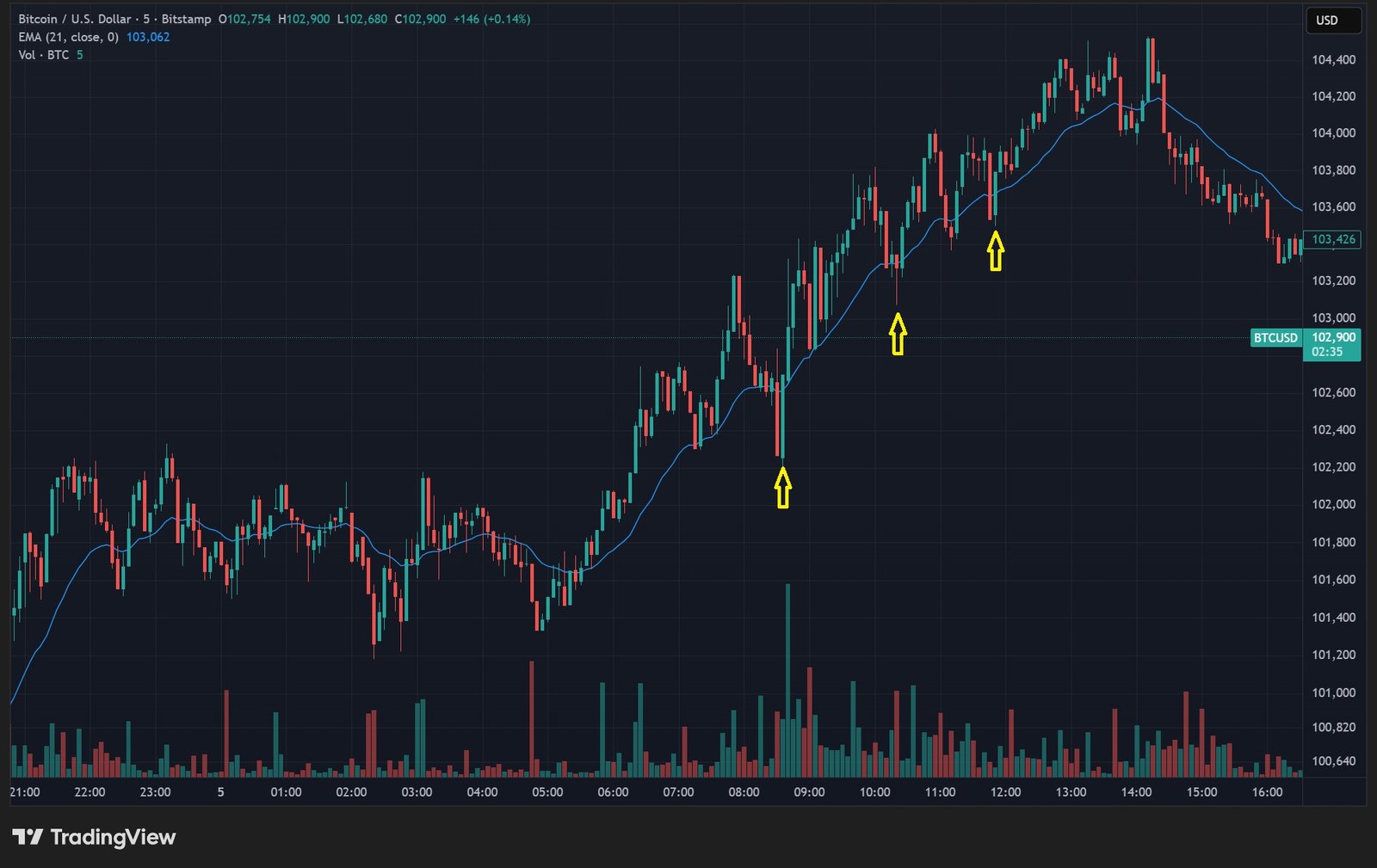 Bitcoin en tendencia alcista. El precio retrocede hacia la EMA 21, deja una vela alcista con cola inferior larga (señal de rechazo) y retoma el movimiento.